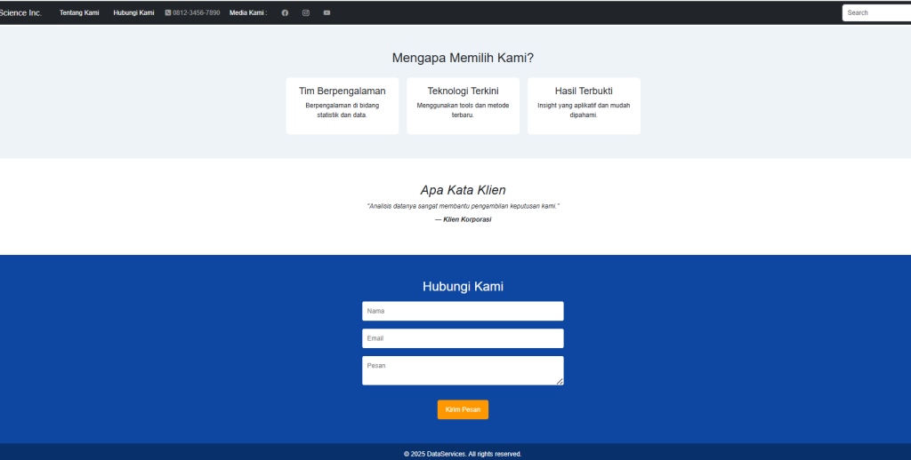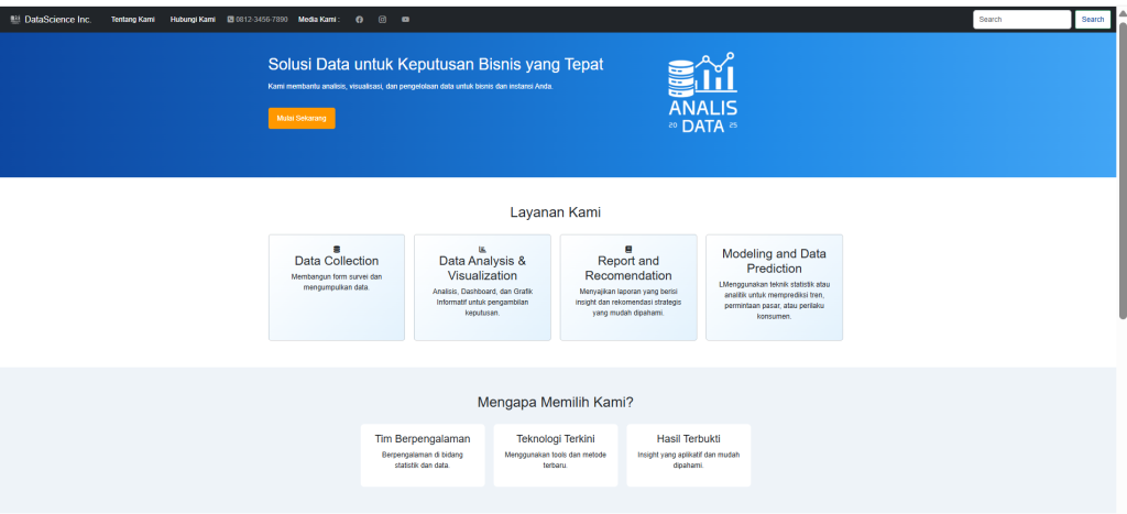 Pada artikel ini, saya akan membuat sebuah landing page yang menawarkan jasa analisis data. Halaman ini dirancang untuk menampilkan informasi layanan yang ditawarkan, alasan memilih jasa tersebut, testimoni klien, serta informasi kontak yang mengarahkan calon klien ke formulir pemesanan.